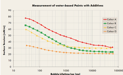 SITA的界面張力儀是基于氣泡壓力法,測試通過從一個高動態(tài)到準(zhǔn)靜態(tài)的過程。尤其是SITA的t60/2界面張力儀,更是適合實驗室應(yīng)用,它是從30毫秒的氣泡壽命時間開始測試。因此,取決于氣泡壽命時間的色漿的表面張力的測試,是為了更好地讓表面張力在某個氣泡壽命時間達到特定的值,而這個氣泡壽命時間是正式客戶要求達到潤濕的時間。