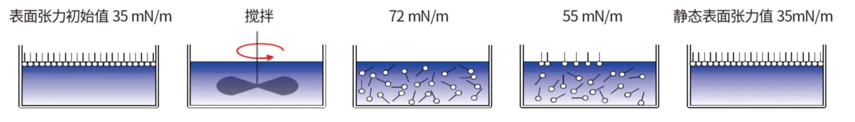 代表了表面活性劑的變化。表面活性劑被廣泛應用于許多工業中,發揮作用的是它們的表面活性,即它們擴散和吸附到新形成界面并影響其表面張力。進一步,發揮作用的是表面活性劑的吸附過程快慢,以及在短時間內表面張力的下降速度,要符合使用者的需求。因此使用者可能會尋找許多表面活性劑來測試不同環境下的實際效果,對于研發與生產都需要花費大量時間與成本。